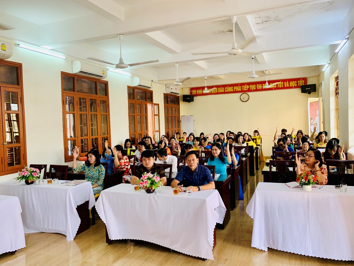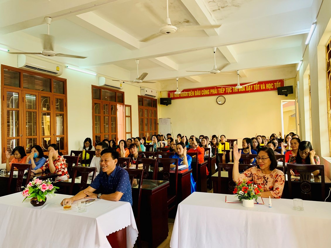 Thay mặt lãnh đạo nhà trường, đồng chí Nguyễn Thị Mai Hương - Bí thư Chi bộ, Hiệu trưởng nhà trường trình bày tóm tắt báo cáo tổng kết năm học 2021-2022 và kế hoạch thực hiện nhiệm vụ năm học 2022-2023. Với tinh thần dân chủ, tinh thần trách nhiệm, hội nghị đã tiến hành thảo luận đóng góp xây dựng hoàn thiện kế hoạch nhiệm vụ năm học. Đặc biệt, hội nghị tập trung vào các nhiệm vụ trọng tâm năm học, các mục tiêu, giải pháp nhằm nâng cao chuyên môn, đổi mới phương pháp dạy học; nâng cao vai trò của giáo viên chủ nhiệm lớp trong việc tổ chức, phối hợp giáo dục toàn diện học sinh; nâng cao phương thức giáo dục đạo đức, giáo dục ngoài giờ lên lớp, giáo dục hướng nghiệp theo tinh thần lồng ghép và tích hợp; chú trọng giáo dục kỹ năng sống cho học sinh; nâng cao chất lượng các đội tuyển học sinh giỏi, toàn thể Hội nghị đã biểu quyết các chỉ tiêu cần đạt trong năm học. Bằng tinh thần thống nhất và quyết tâm cao, toàn thể Hội nghị đã tiến hành biểu quyết các chỉ tiêu cần đạt trong năm học mới 2022 - 2023. Cuối cùng, Hội nghị thông qua Nghị quyết với nhiều nội dung quan trọng về công tác chính trị tư tưởng,công tác thi đua, nêu rõ trách nhiệm của Hiệu trưởng, Chủ tịch công đoàn và các tổ chức đoàn thể trong nhà trường đồng thời kêu gọi toàn thể phát huy những thành tích đã đạt được, phấn đấu hoàn thành tốt nhiệm vụ được giao.