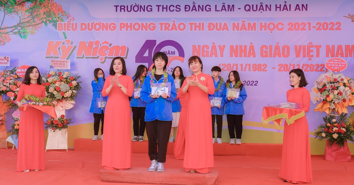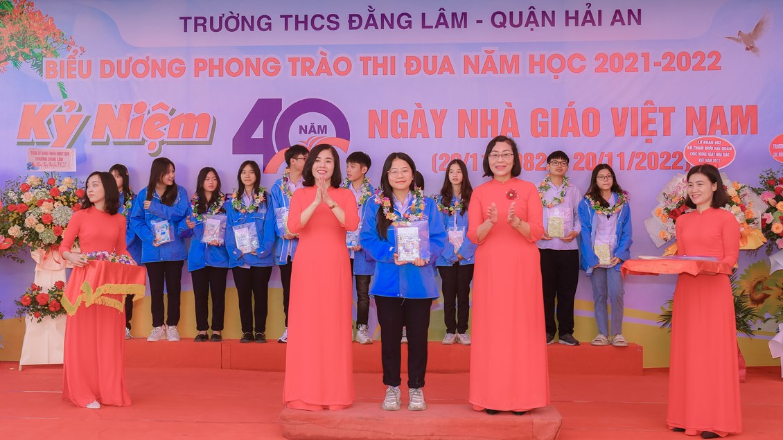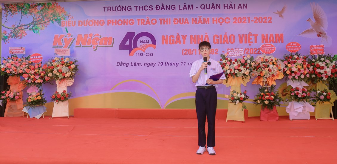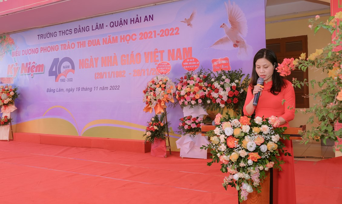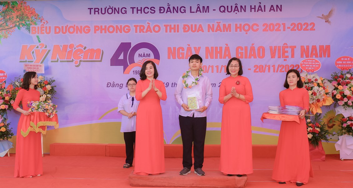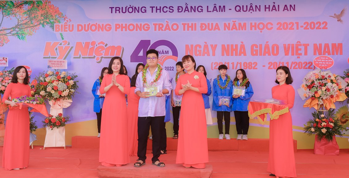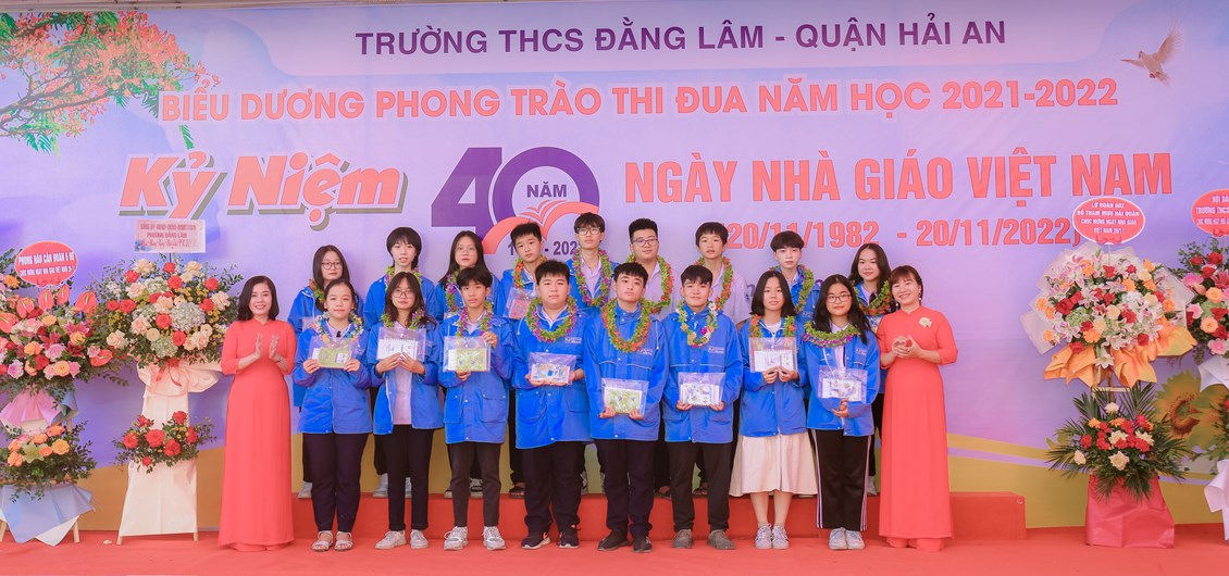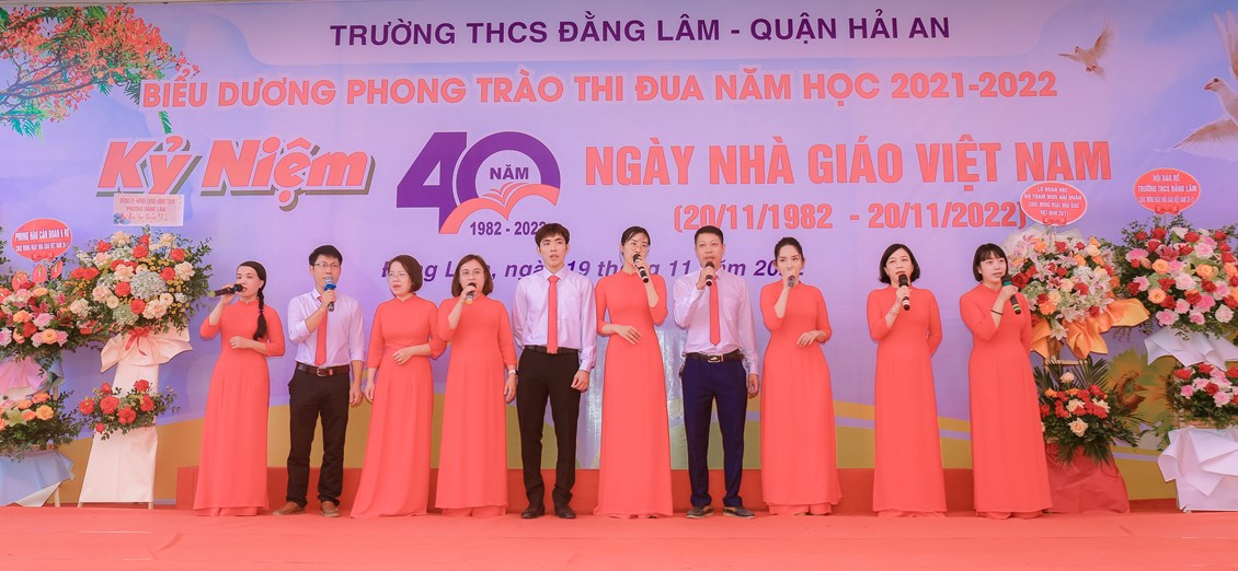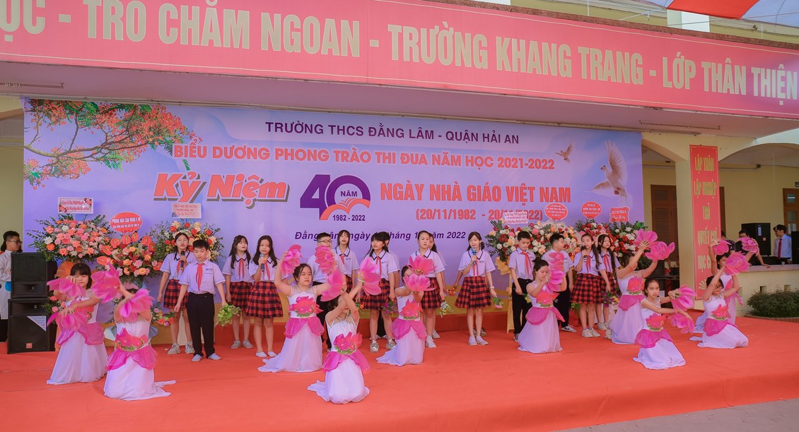 Hòa chung không khí tưng bừng, phấn khởi của ngành giáo dục cả nước kỷ niệm 40 năm ngày Nhà giáo Việt Nam (20/11/1982 - 20/11/2022) để bày tỏ lòng biết ơn sâu sắc tới các thế hệ nhà giáo, các cán bộ viên chức đã cống hiến cho sự nghiệp giáo dục và sự phát triển của nhà trường đồng thời biểu dương những tấm gương thầy cô giáo và các em học sinh có những thành tích đáng tự hào trong năm học 2021-2022 đồng thời giáo dục truyền thống Tôn sư, trọng đạo cho học sinh, từ 8h ngày 19/11/2022, trường THCS Đằng Lâm long trọng tổ chức Hội nghị biểu dương phong trào thi đua năm học 2021-2022 và kỷ niệm 40 năm ngày Nhà giáo Việt Nam (20/11/1982-20/11/2022)