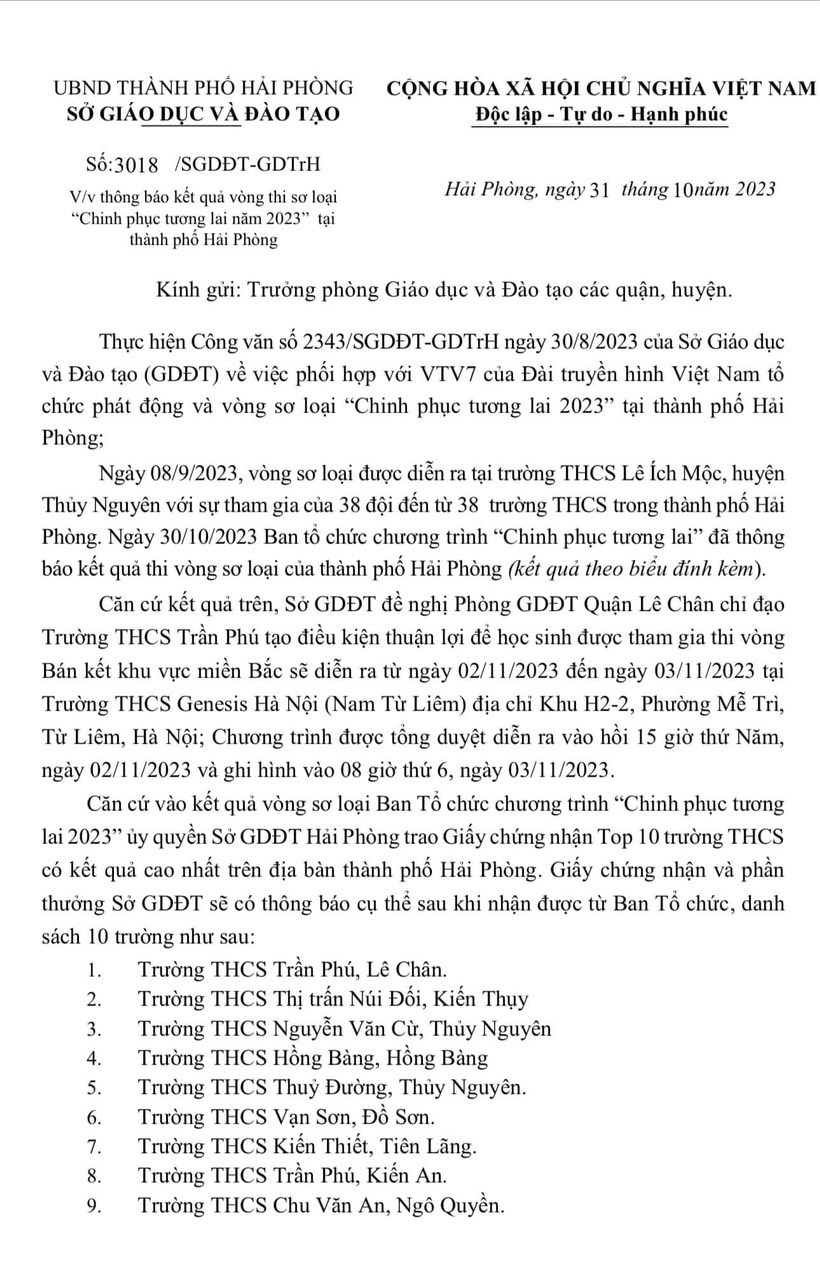 Căn cứ thông báo số 3018/SGD&ĐT-GDTrH của Sở GD&ĐT Hải Phòng về việc thông báo kết quả vòng thi sơ loại “Chinh phục tương lai năm 2023” tại Thành phố Hải Phòng, trường THCS Đằng Lâm đạt thành tích top 10 trường THCS có kết quả thi cao nhất toàn Thành phố tại cuộc thi “Chinh phục tương lai năm 2023” do Ban Khoa giáo, Đài THVN phối hợp với Sở GD&ĐT Hải Phòng tổ chức🌷