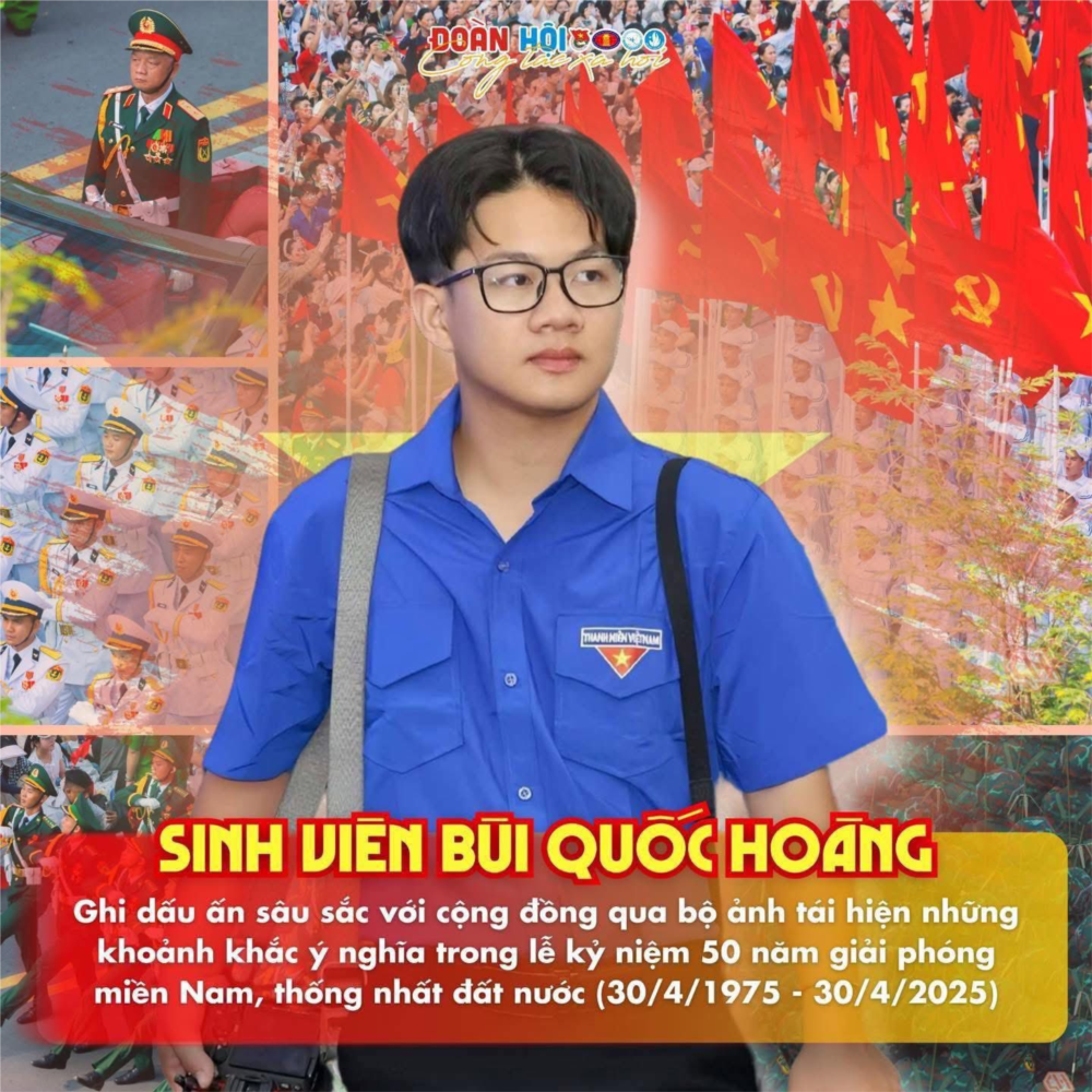 Bùi Quốc Hoàng (22 tuổi, TP.HCM) là tác giả bộ ảnh chụp lễ diễu binh, diễu hành ngày 30/4 đầy cảm xúc được nhiều bạn trẻ chia sẻ trên mạng. Hoàng đang là sinh viên năm 4, ngành Công tác xã hội, Trường đại học Khoa học xã hội và Nhân Văn (Đại học Quốc gia TP.HCM) và đang sinh hoạt tại CLB Nhiếp ảnh Trẻ TP.HCM.