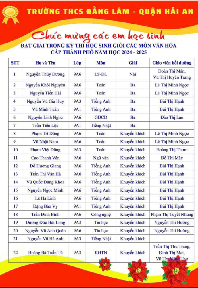 🌸 Theo Quyết định số 395/ QĐ-SGDĐT ngày 17/01/2025 của Sở GD&ĐT về kết quả xếp giải học sinh đạt giải trong kì thi chọn học sinh Giỏi Thành phố cấp THCS năm học 2024-2025, trường THCS Đằng Lâm vui mừng có 22 học sinh đạt giải học sinh Giỏi Thành phố các môn văn hoá: Toán, Ngữ Văn, Tiếng Anh, Tiếng Nhật, KHTN, Lịch sử - Địa lý, GDCD, Tin học. Đây là thành tích đáng tự hào, tiếp nối truyền thống học tập tốt - rèn luyện chăm của thầy và trò nhà trường trong những năm vừa qua💯💯